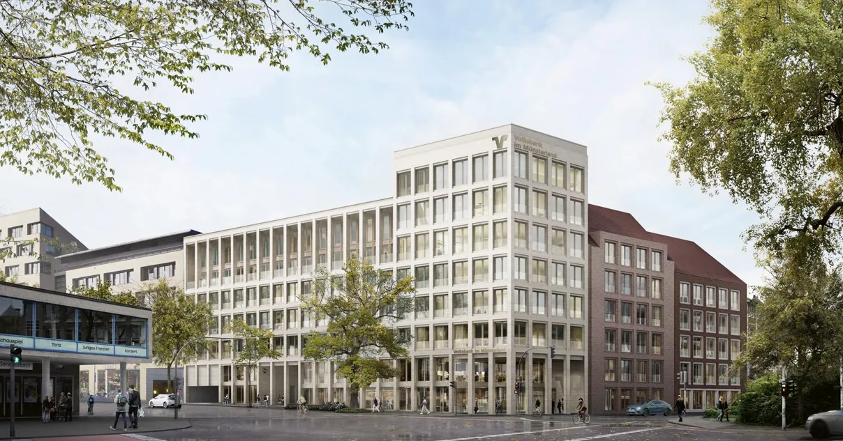 Als Leuchtturmprojekt der Volksbank im Münsterland entsteht im Herzen von Münster ein neues Quartier. Zwischen Roggenmarkt und Theater bietet es viel Raum für Neues: modern, nahbar und offen für Begegnung. Hier, in einer Toplage der Stadt, hat die Volksbank im Münsterland ihren Hauptsitz. Nach über 40 Jahren nutzen wir die Chance, unsere Hauptstelle umfassend zu erneuern und sie in das lebendige Quartiersprojekt einzubinden.